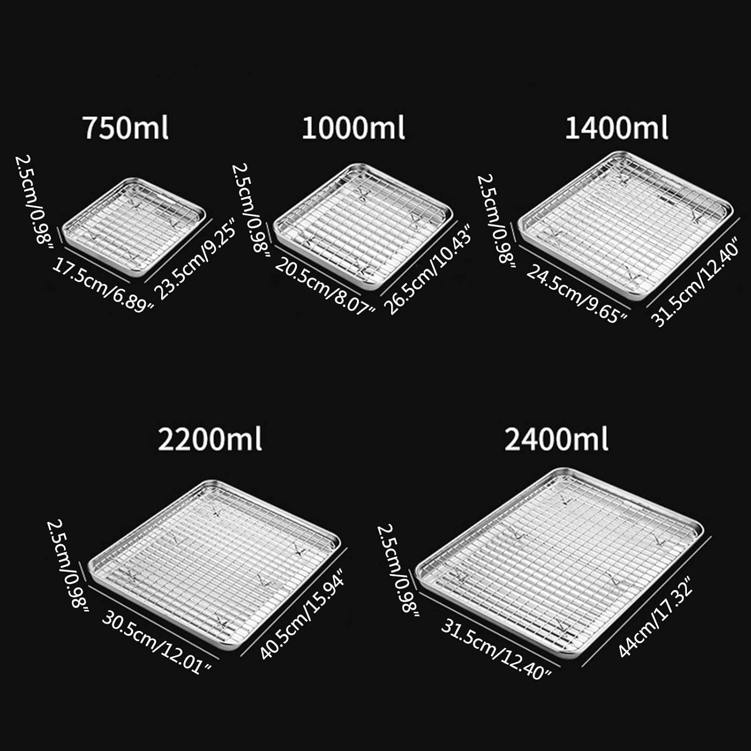 304Stainless Steel Baking Tray Baking Plates BBQ Tray With Removable Cooling Rack Baking Pan Sheet Oven Dishwasher SafeFeatures:Perfect be used as cookie sheet or baking sheet for your regular oven and toasters oven.Crafted with 304stainless steel Texture. Rusts for many years.Suitable for broiling meat, or dusting all manner of cakes and confections as well as holding breaded items waiting be frieds.full side around food juices from flowing everywhere to keep your oven neat.Both cookie sheet and baking rack, dishwasher safe to save your labor.Specifications:Component: 304Stainless Steel750ml Size: Approx. 6.89x9.25x0.98inch(17.5x23.5x2.50cm)1000ml Size: Approx. 8.07x10.43x0.98inch(20.5x26.5x2.50cm)1400ml Size: Approx. 9.65x12.40x0.98inch(24.5x31.5x2.50cm)2000ml Size: Approx. 12.01x15.94x0.98inch(30.5x40.5x2.50cm)2400ml Size: Approx. 12.40x17.32x0.98inch(31.5x44x2.50cm)Package Includes:1PC Cookie Baking PanNote:Please allow 1-2cm errors due to manual measurement.Due to the differences between different monitors, the picture may not reflect the actual color from the item.