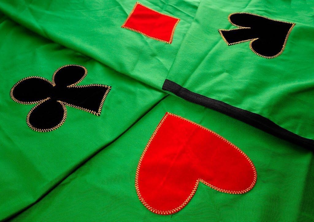 A large size (120cm square) card cloth ideal for playing Bridge and other card games. Made from a mixture of polyester and cotton, the cloth has a good feel to it and cards slide nicely on the surface. This card / Bridge cloth features the the 4 suit symbols, 1 in each corner, as decoration. This cloth is machine washable.Contains small parts. Unsuitable for people vulnerable to choking hazards..Approx. dimensions: 3.9x3.9 feetProduct Ref.: 00K772