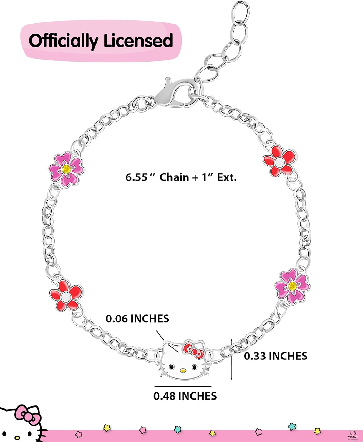 Introducing the officially licensed Hello Kitty jewelry collection, where you can proudly showcase your affection for Hello Kitty through eye-catching accessories. One standout piece is this silver bracelet adorned with an enamel-plated Hello Kitty pendant. Encircling the bracelet are four stationary red flowers or red hearts, adding a touch of charm to its design. Crafted from silver-plated brass, the Sanrio bracelet measure at 6.5 inches with an inch extender for a customizable fit.